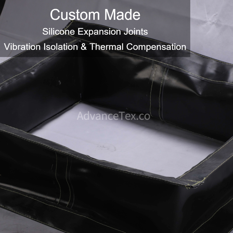 A robust, custom-fabricated rectangular expansion joint made from durable black silicone fiberglass. Provides reliable environmental sealing, chemical resistance, and vibration dampening for heavy industrial ducting and exhaust systems.